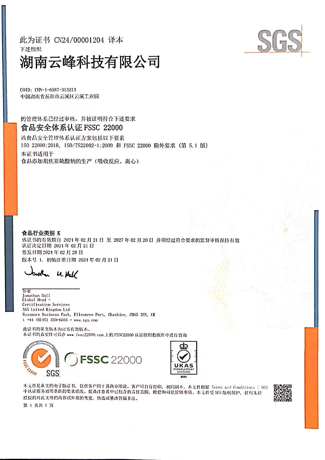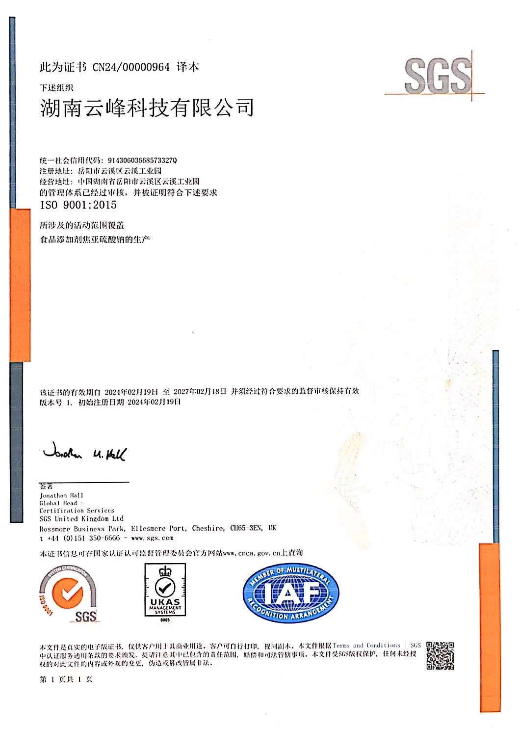 湖南云峰科技有限公司(以下簡稱云峰科技),是由長沙湘岳化工責任有限公司全額投資以生產(chǎn)焦亞硫酸鈉、亞硫酸鈉等亞硫酸鹽為主營業(yè)務的高科技企業(yè),具有六十多年的生產(chǎn)歷史,同時也是焦亞硫酸鈉的國家標準制定參與者。在行業(yè)內(nèi)具有很大的影響力。現(xiàn)有職工八十余人。具有優(yōu)良的經(jīng)營管理團隊和成熟的生產(chǎn)技術隊伍。由多位在化學、化工行業(yè)擁有豐富工作經(jīng)驗的工程師及技術員團隊組建而成,致力于亞硫酸鹽產(chǎn)品的研發(fā)、生產(chǎn)和銷售。2020年公司對生產(chǎn)設備、安環(huán)設施及工業(yè)技術等進行了大規(guī)模的升級改造,使焦亞硫酸鈉和亞硫酸鈉的生產(chǎn)工藝更加先進,技術更成熟,產(chǎn)品質(zhì)量更優(yōu)良。無論在生產(chǎn)工藝、設備、產(chǎn)品質(zhì)量、清潔生產(chǎn)、節(jié)能環(huán)保和員工素質(zhì)方面,均處于行業(yè)領先地位。公司的主導產(chǎn)品“云峰”牌焦亞硫酸鈉,歷史悠久,深受國內(nèi)外客戶信賴,產(chǎn)品遠銷東南亞、歐美、非洲、南美洲等20多個國家和地區(qū),產(chǎn)品供不應求。
